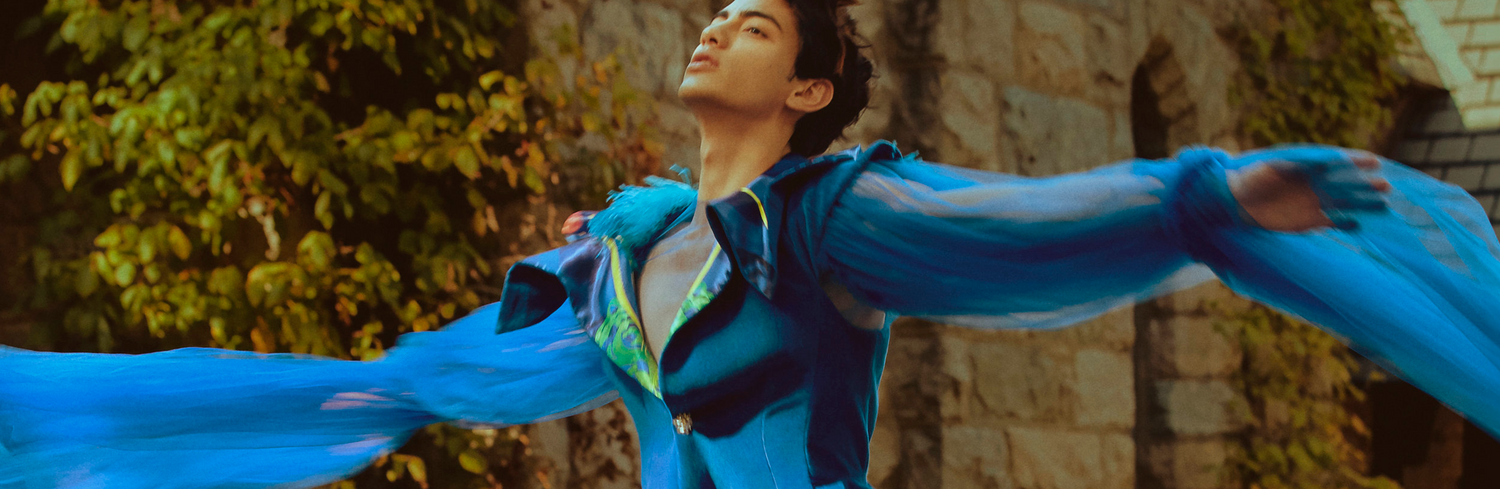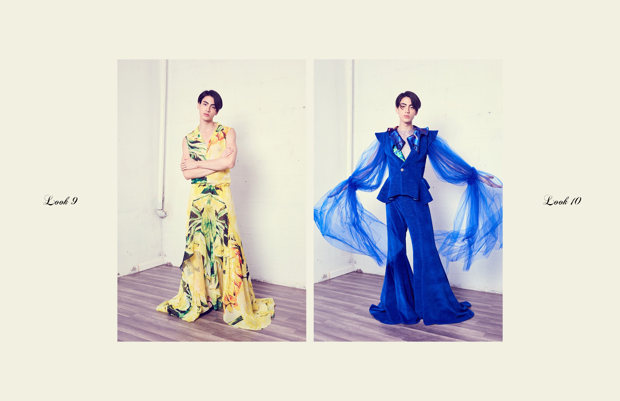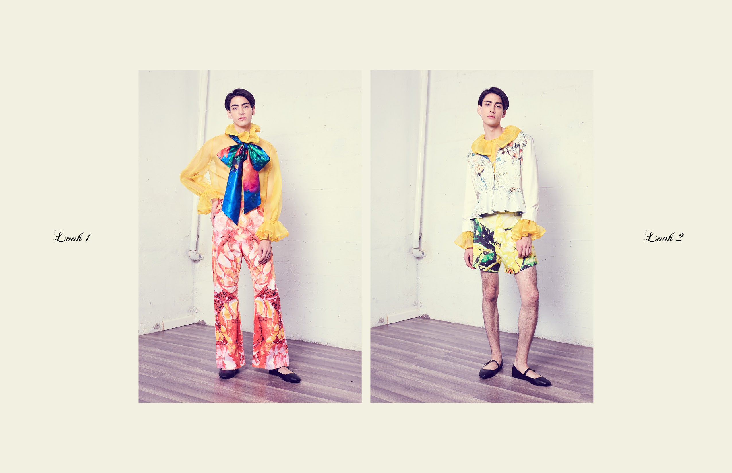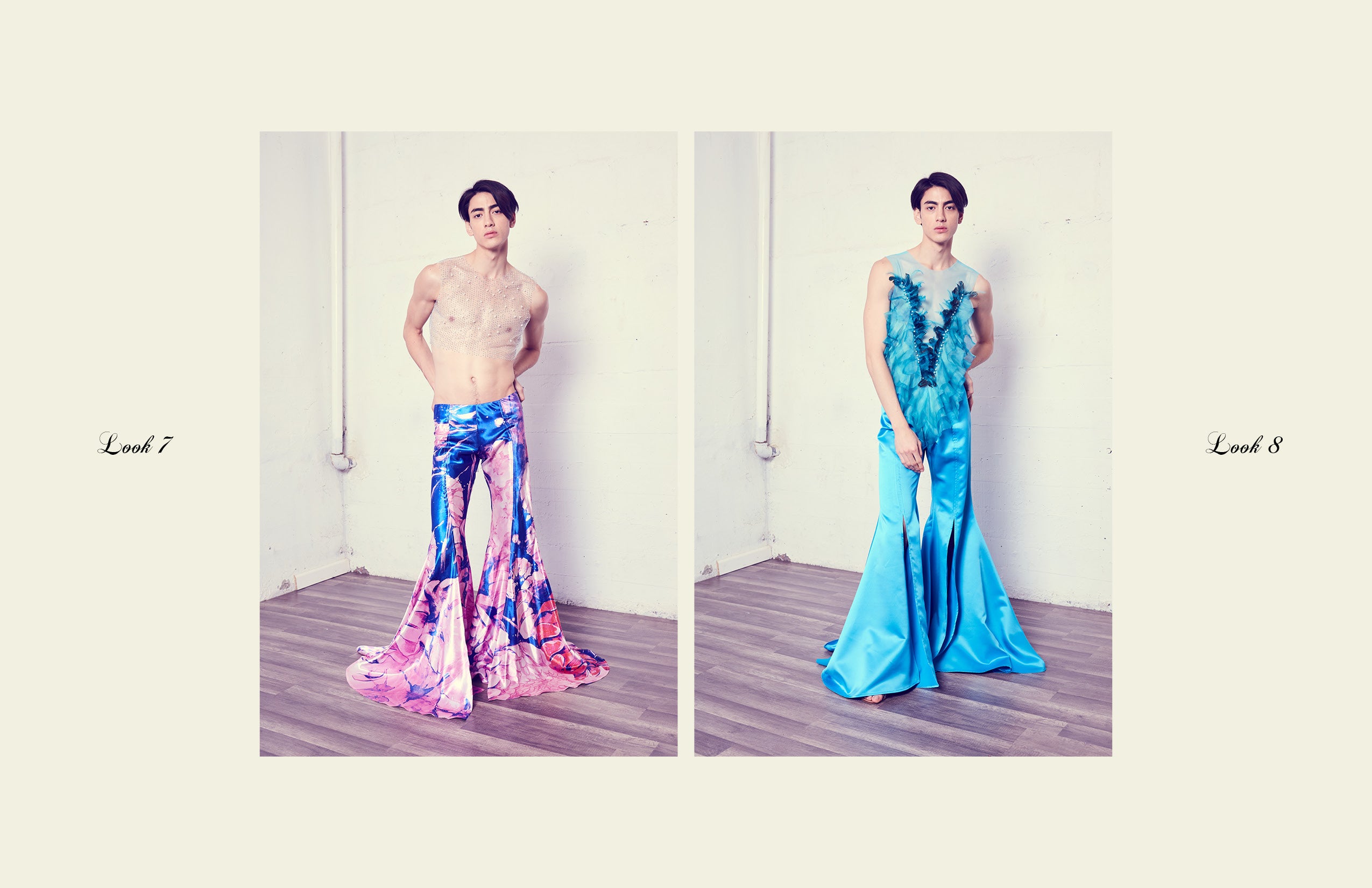Classic Disney prince and princess designs as main inspirations, the collection juxtaposes the opposite two, masculine and feminine, in order to reimagine fluid beauty in both traditional and modern silhouettes. While mainly focusing on representing male-femininity, various styles from casual to formal and evening attire were designed to create diversity, and many possibilities to imagine what "fluidity" means in the context of contemporary fashion and society that progress towards more increased equality and inclusion. Taken inspiration from the traditional hymn, the photography series is a visualization of faith in the inheritance of a land of freedom, love, and acceptance for everyone who believes in fluid beauty.