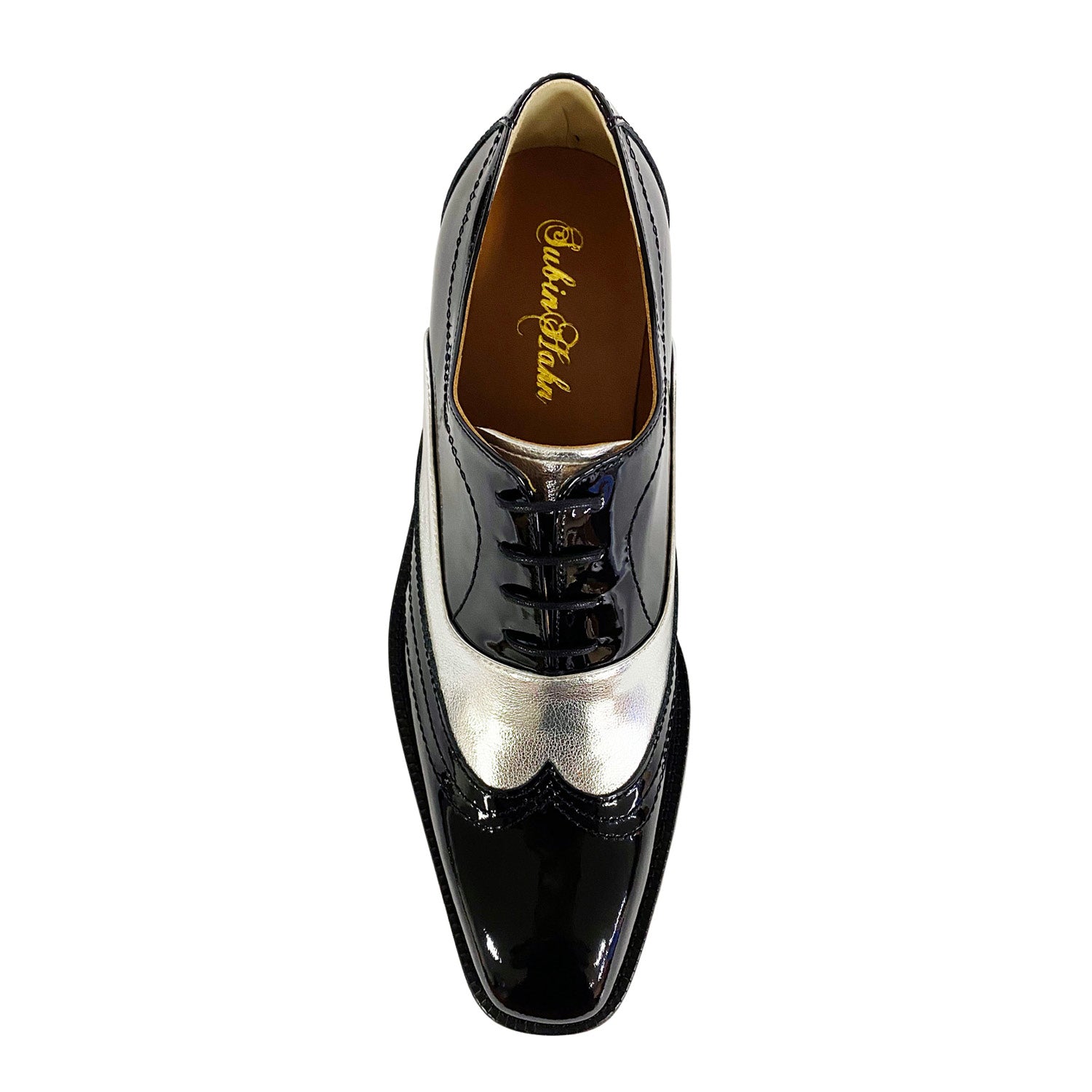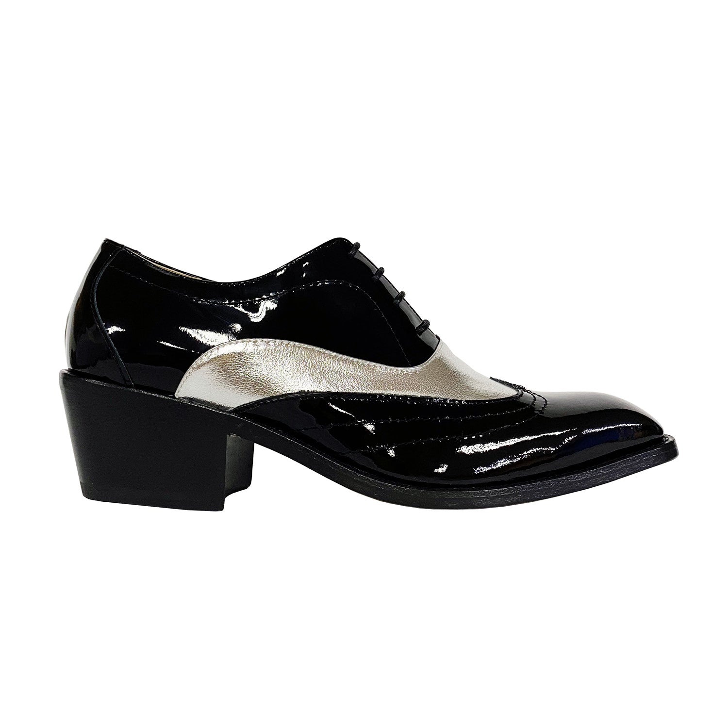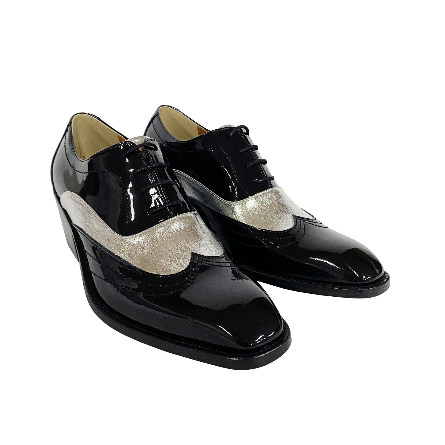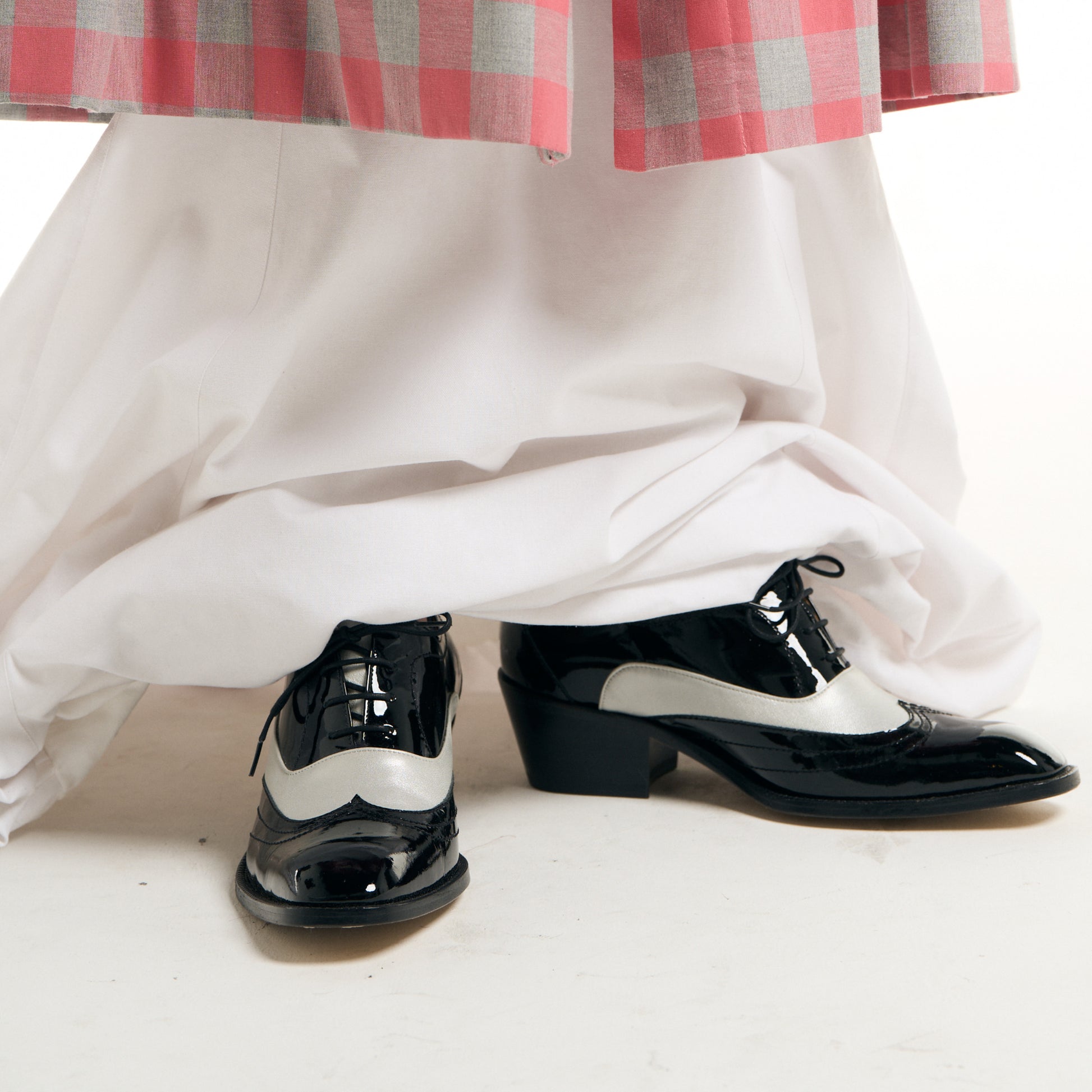These color block shoes reimagine classic oxford style by adding decorative topstitch details around the wingtip reflecting the dynamic, fluid, and ornamental characteristics of Baroque sculpture. The mid-block heel and sleek square toe shape create a modern allure, while the gold print signature decorates the insole of the shoe as a finishing detail.