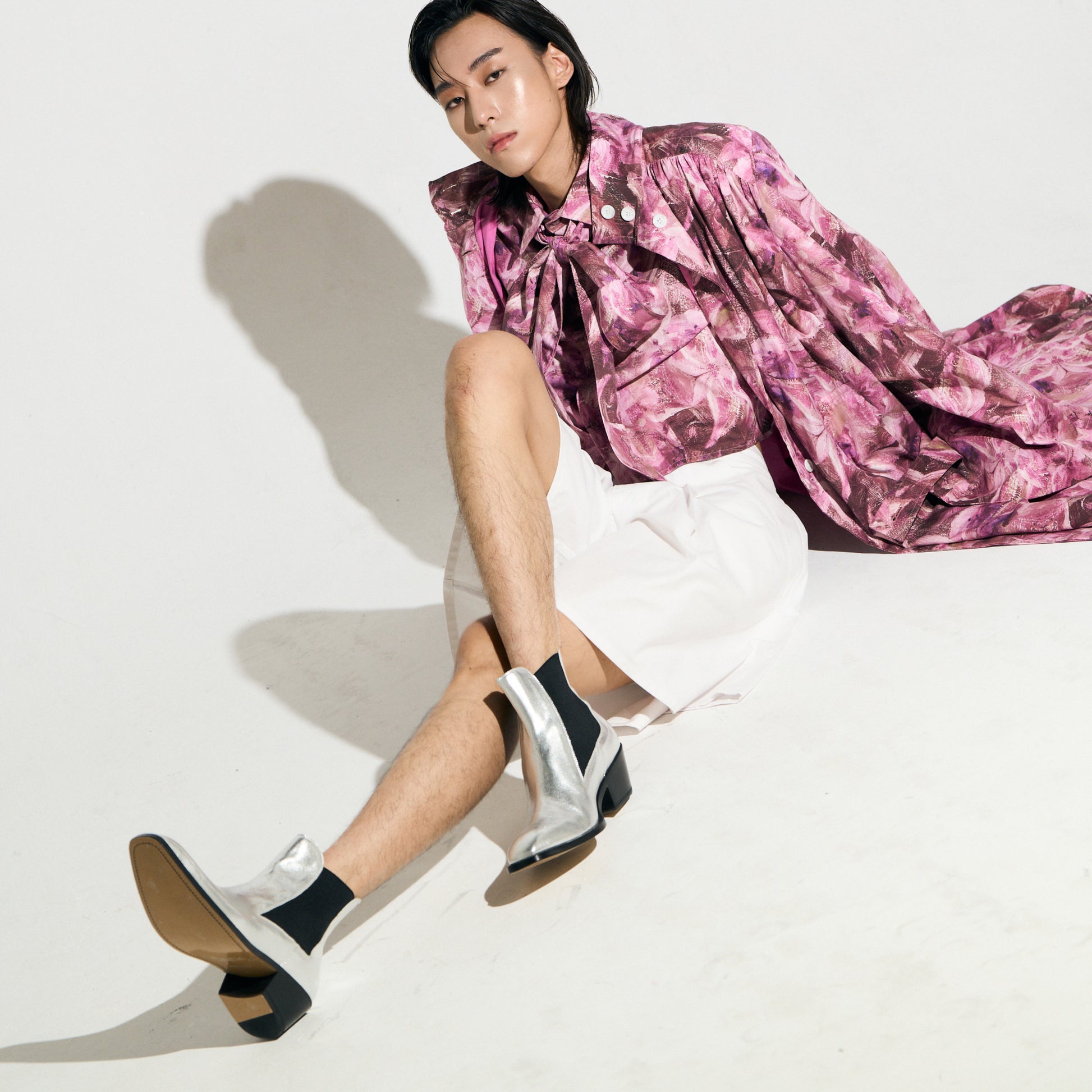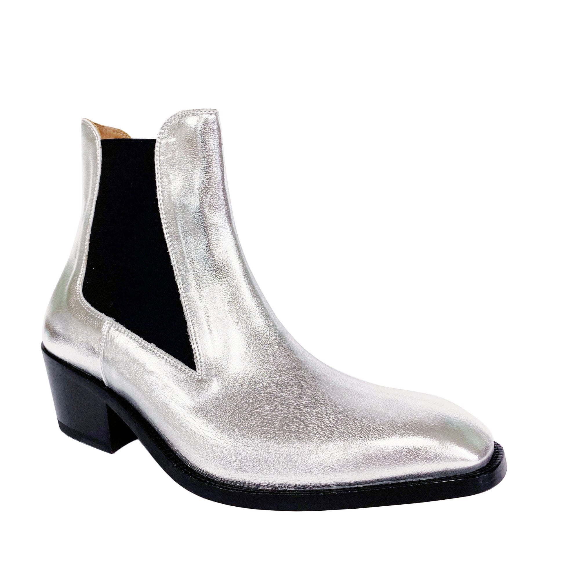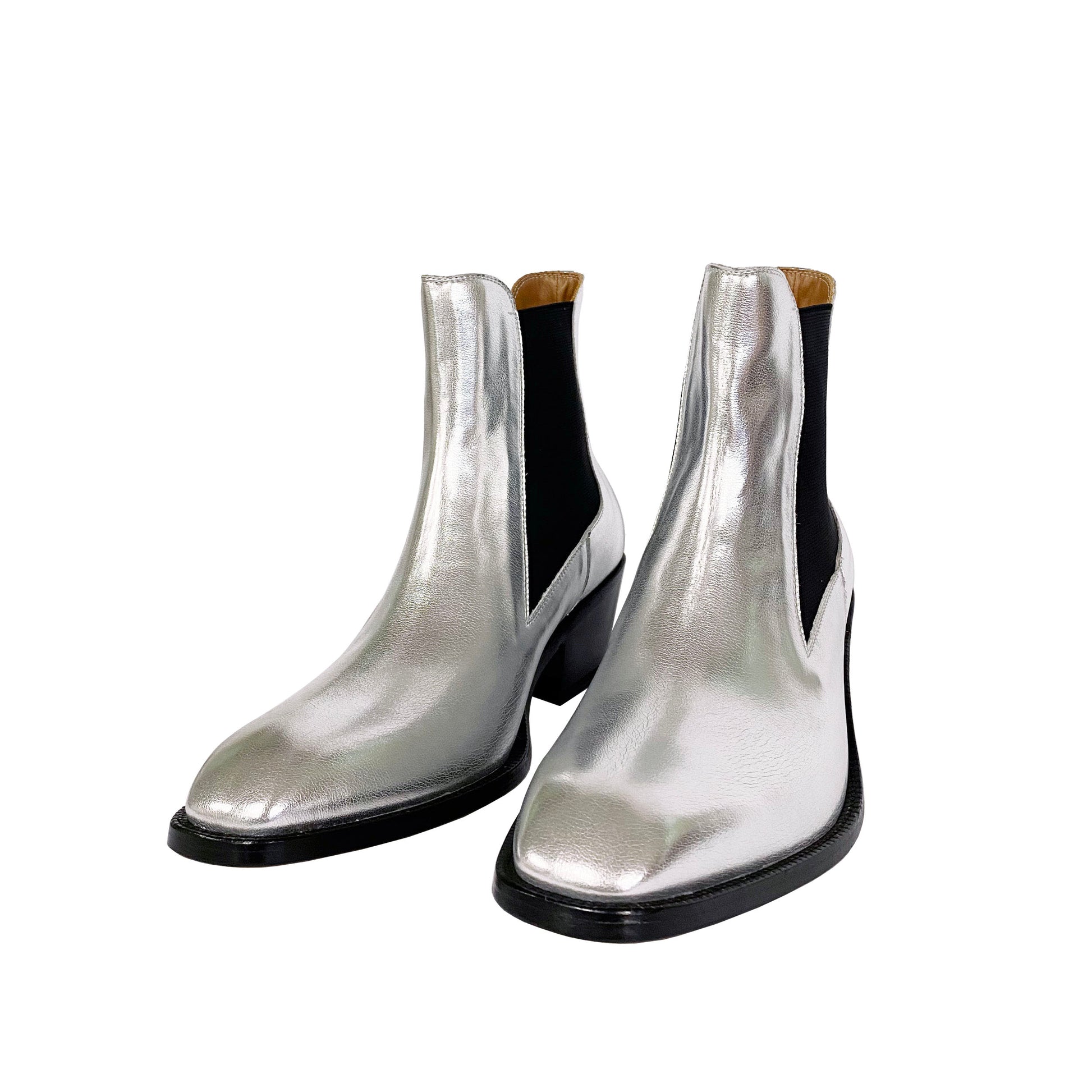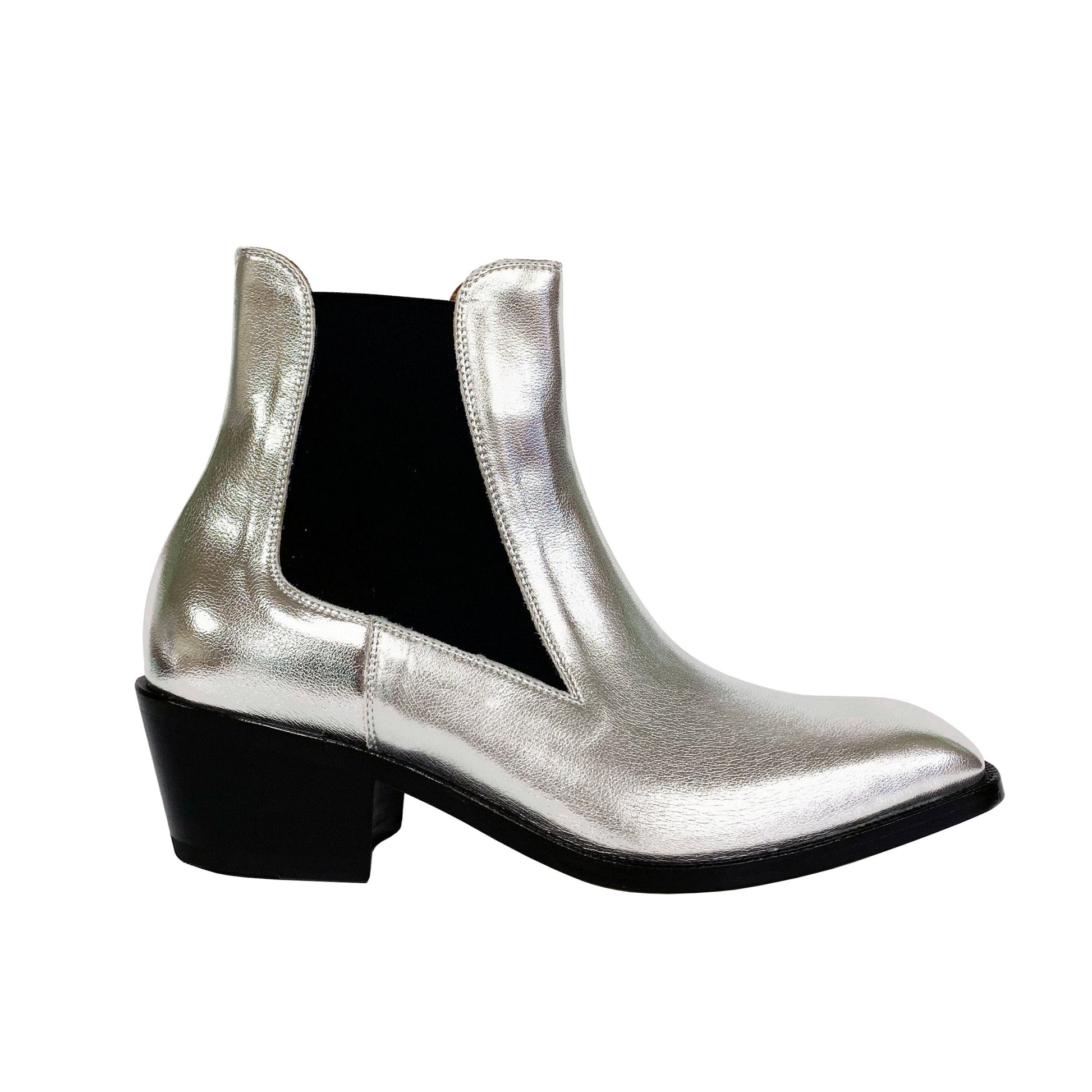 Ankle boot with a square toe, mid-heel, and elasticized sides.
