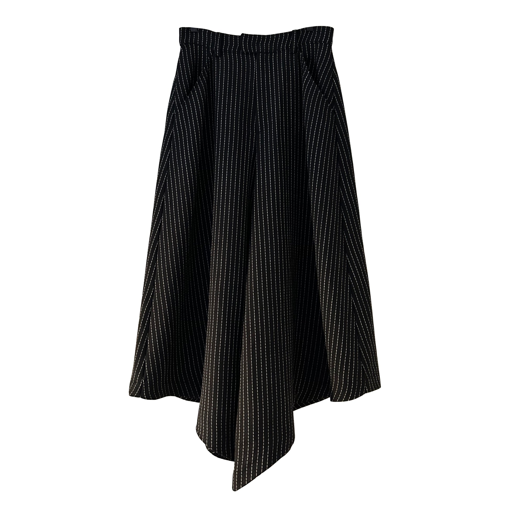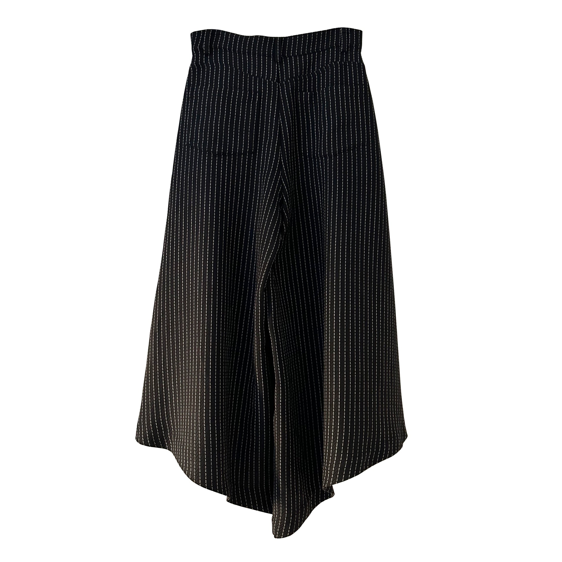 Subin Hahn's Wide Flare High Waisted Pant series from the Fluidwear collection is designed to resemble the look of a skirt from a distance. Made of high-quality heavy-weight wool pinstripe fabric imported from Japan, this classic piece with a contemporary twist will help you create a sophisticated look for both day and night.
