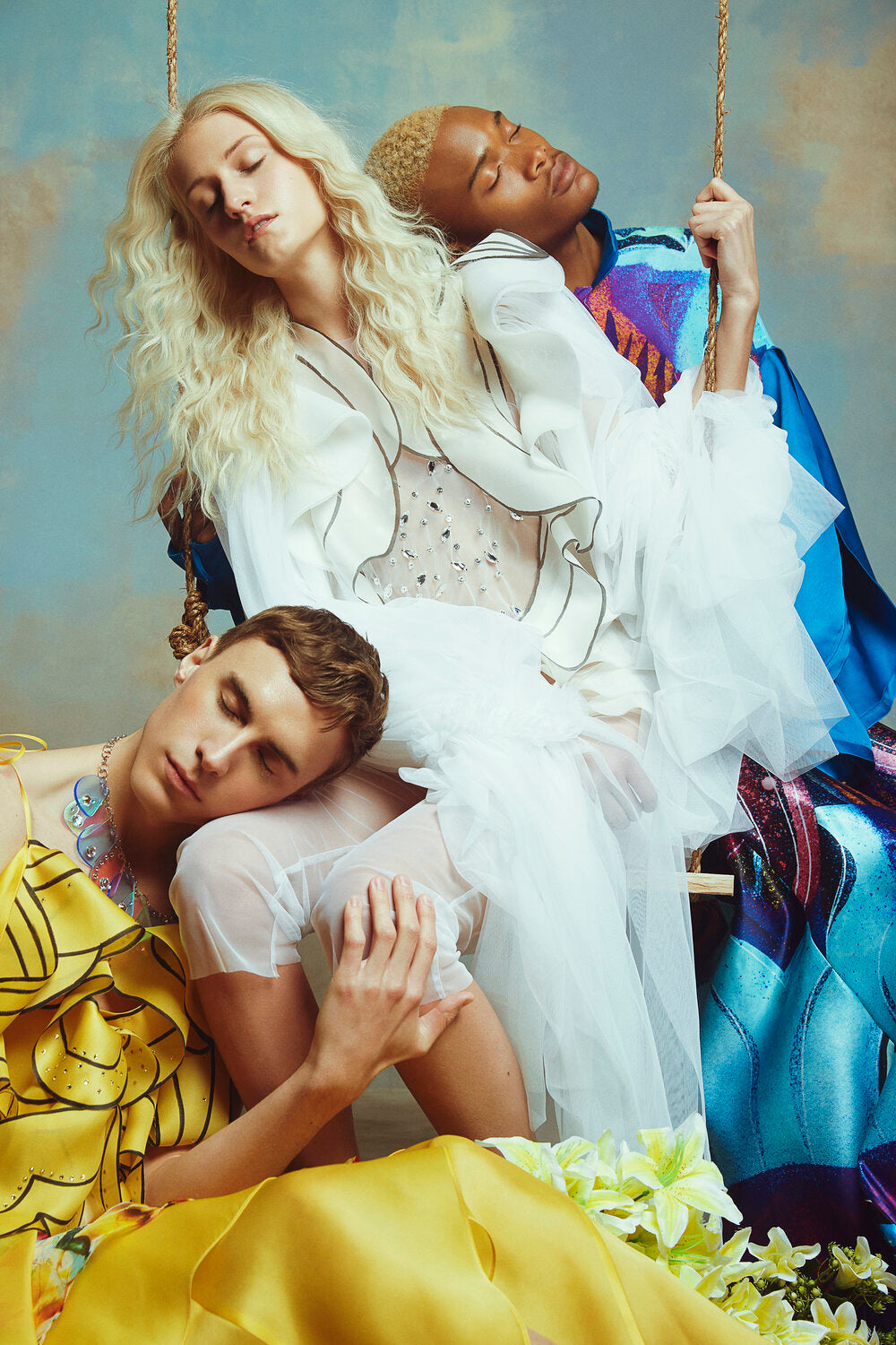 ‘Impression of Tomorrow’ envisions the atmosphere of heaven, a diverse and inclusive environment, where everyone is equally accepted, regardless of gender, ethnicity, and background. The collection is a series of poetic imagery that narrates the designer’s personal story of suppression, liberation, redemption of the past, and faith in a better future dedicated to those who fight for the fluid beauty: the impressions of transfigurative movements and gestures of true freedom and equality.