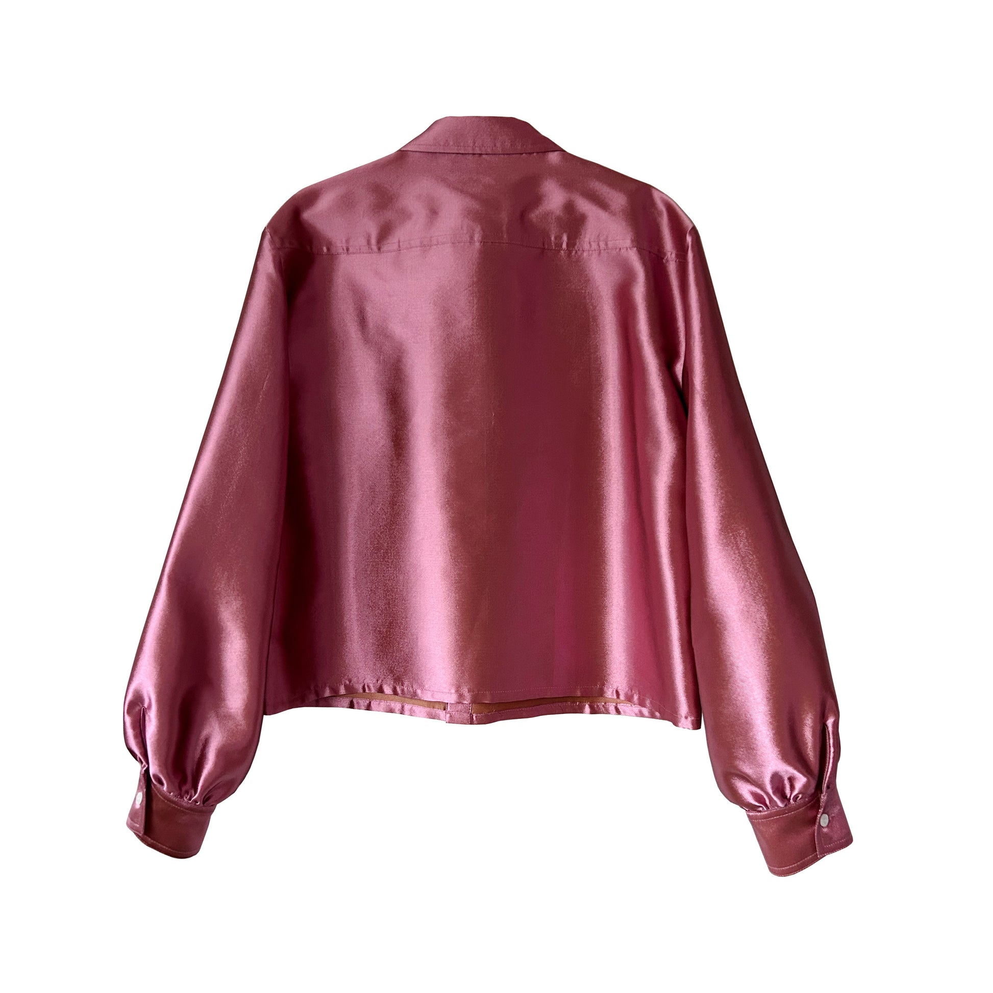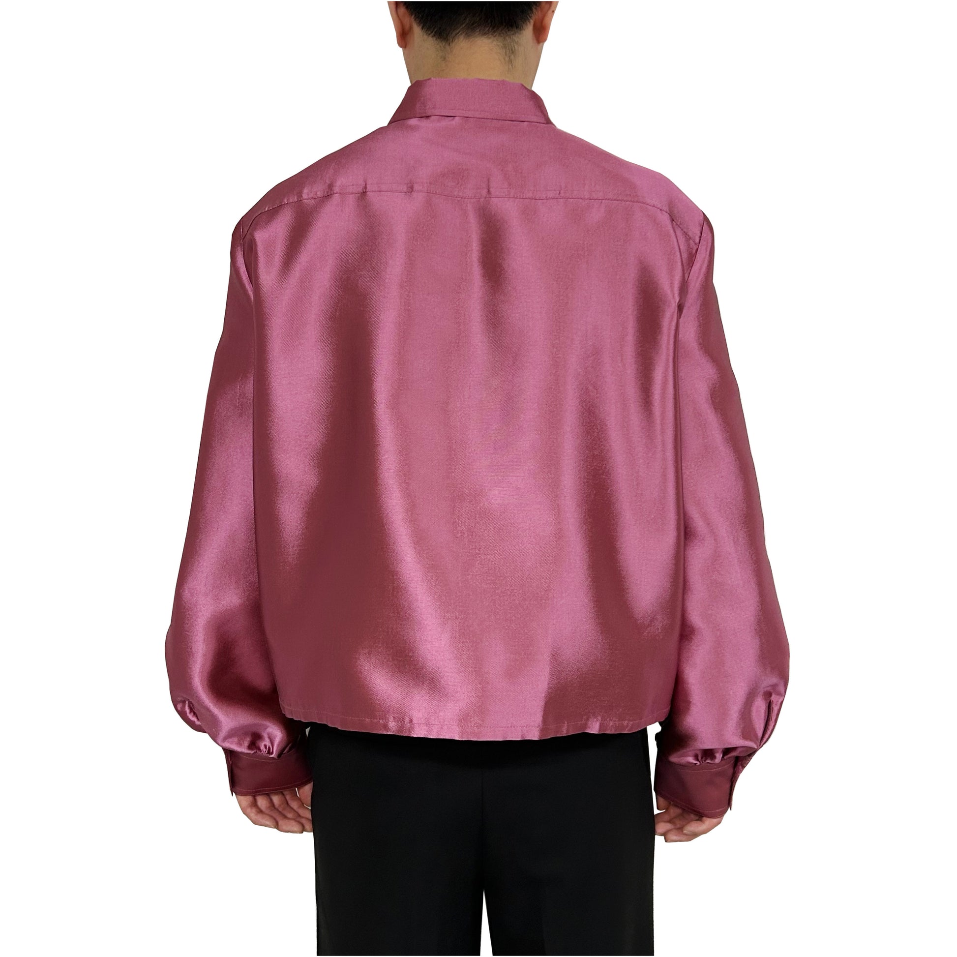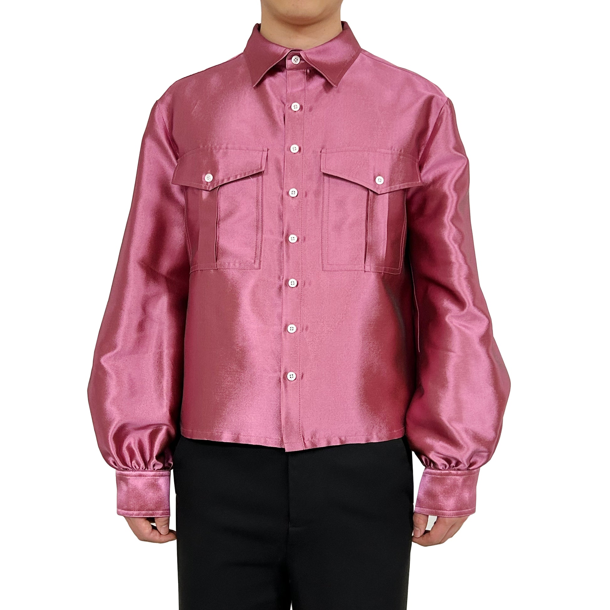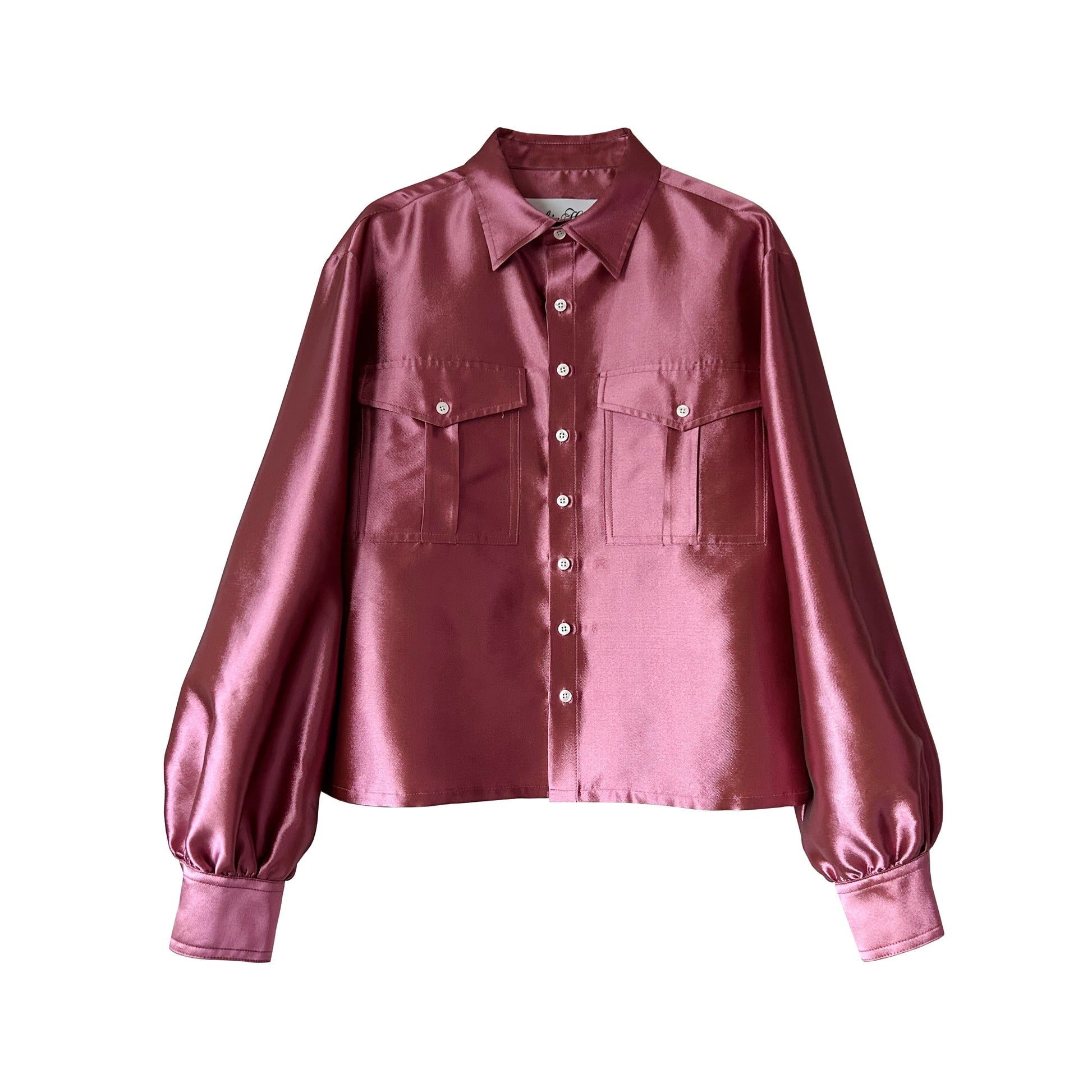 Subin Hahn Fluidwear offers a military-inspired satin blouse designed for all genders. This gender-fluid-fit blouse is slightly cropped in length and cut in a boxy silhouette.