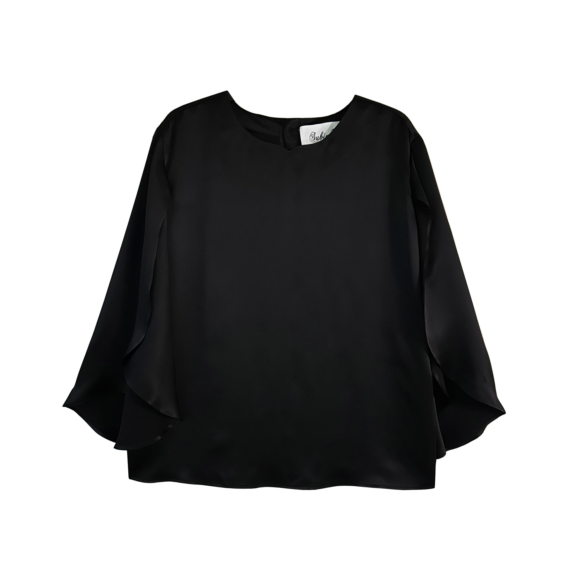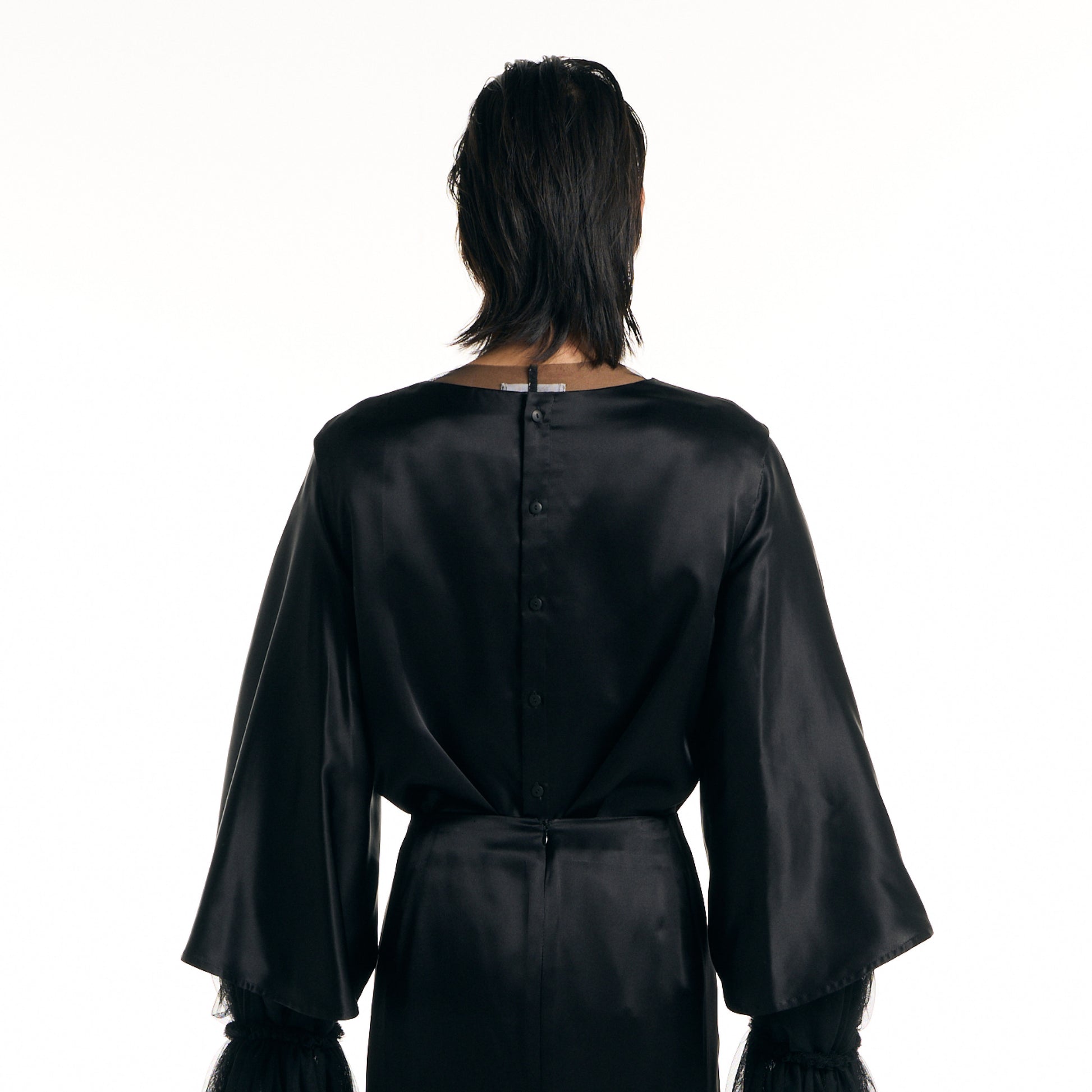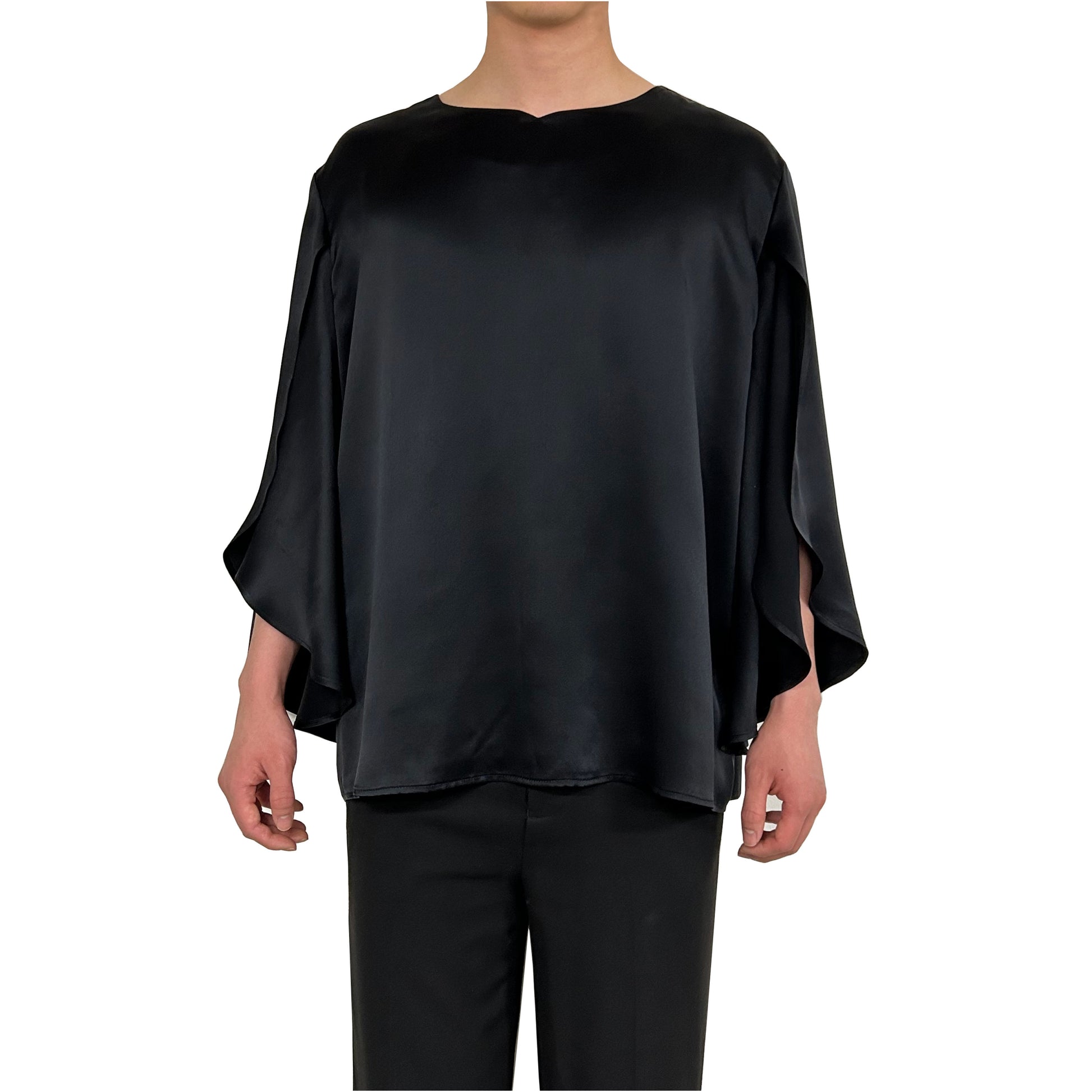 Subin Hahn Fluidwear Collection 6 The Nocturne Blouse in black silk satin features a curved neckline and wing sleeves that create fluid movements.